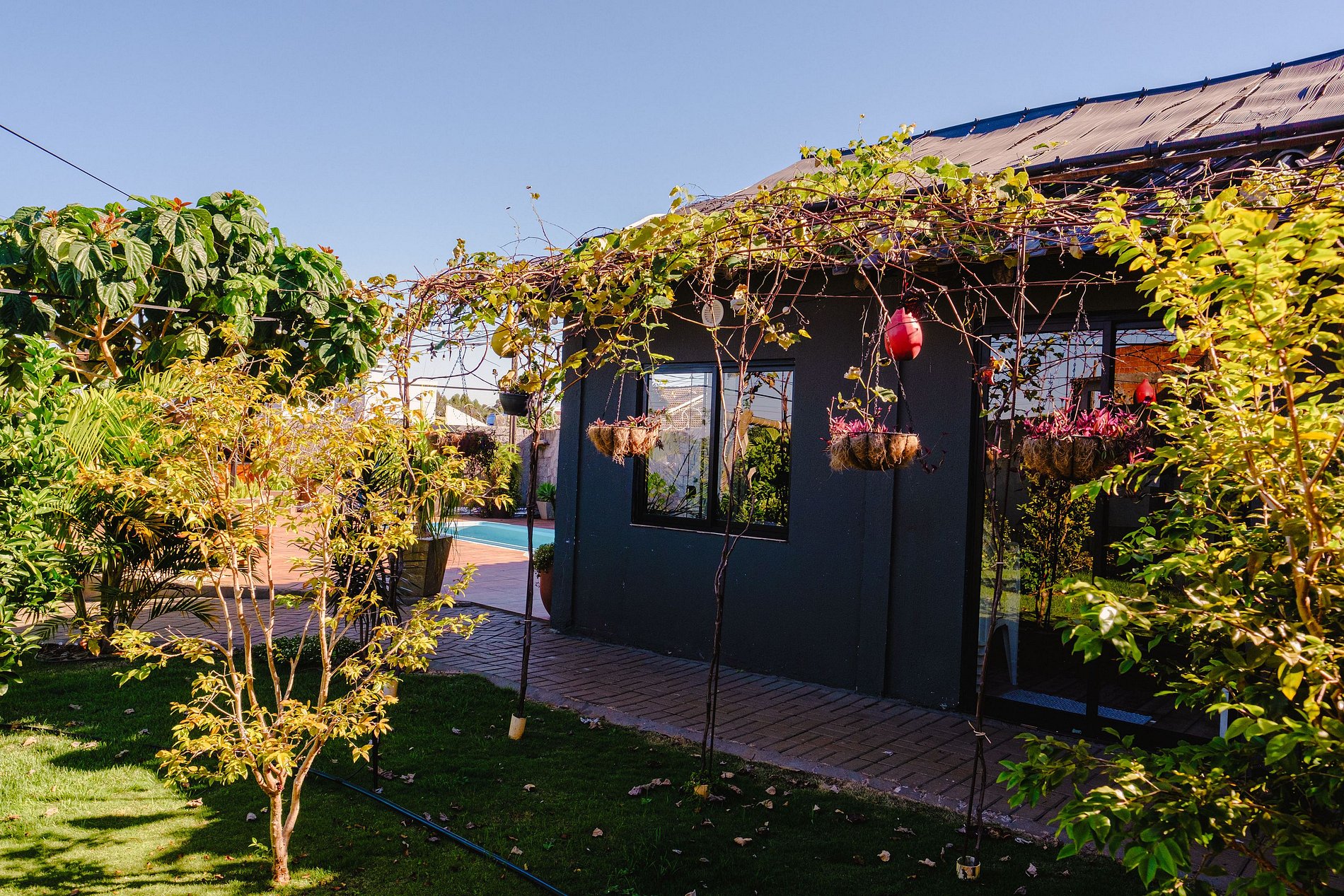 Cabana privativa em Chapecó-SC, cercada por paisagismo. Banheira de hidromassagem, lareira, piscina e churrasqueira para momentos de descanso em casal ou com a família. Pets bem-vindos.